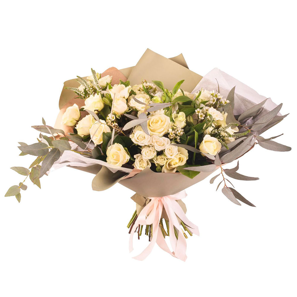 Роза кустовая кремовая, вероника, ваксфлауэр, эвкалипт. Упаковка (лента, пленка, крафт, сетка, пленка матовая)