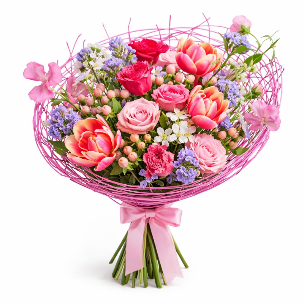 Тюльпан розовый, роза кустовая розовая, олеандр, орнитогалум сандерс, гиперикум, статица. В каркасе