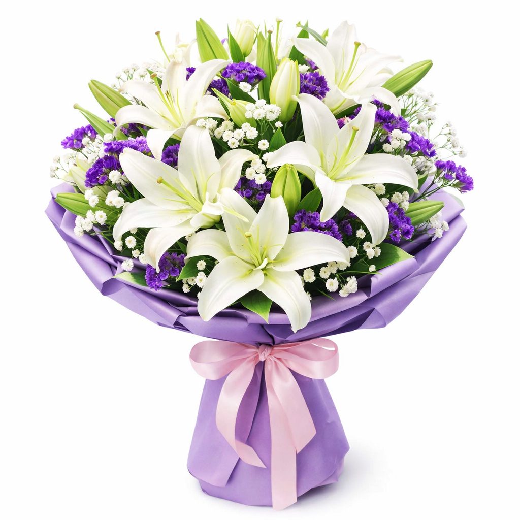 Лилия белая, статица, гипсофила. Упаковка (лента, пленка, крафт, сетка, пленка матовая)