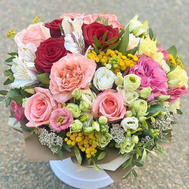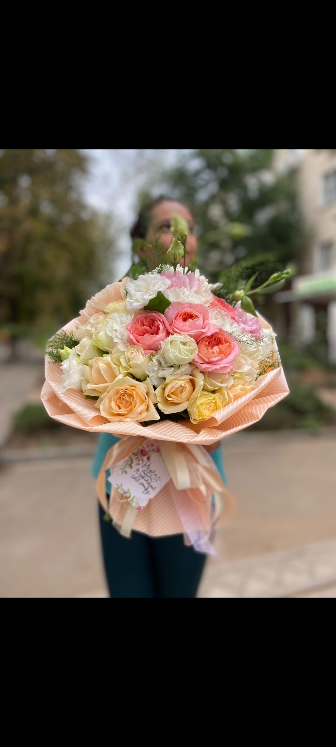 Роза одноголовая розовая, эустома розовая, пион розовый, гвоздика кремовая, эвкалипт. Упаковка (шляпная коробка, квадратный бокс, коробка сердце, оазис)