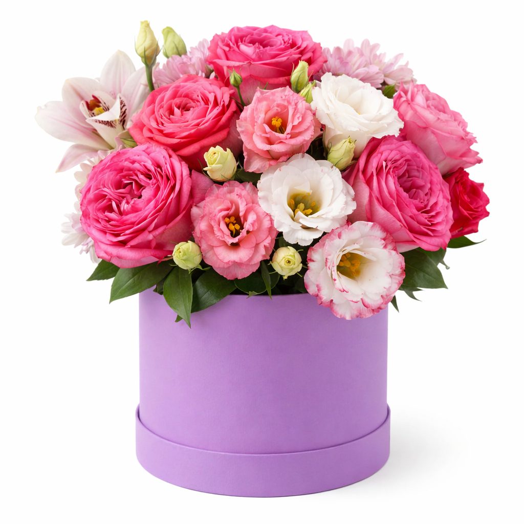 Роза пионовидная розовая, эустома белая и розовая, роза кустовая красная, орхидея розовая, хризантема кустовая нежно розовая. Упаковка (шляпная коробка, квадратный бокс, коробка сердце, оазис)